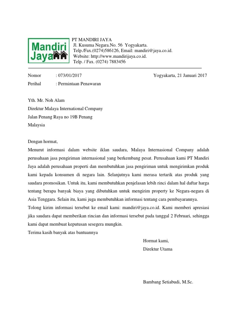 Contoh surat penawaran barang dalam bahasa inggris. Ditulis dalam bahasa yang resmi dan singkat bersama surat ini perkenankan kami memberikan penawaran berbagai alat dan barang yang akan dengan hormat sehubungan dengan adanya surat permintaan profile serta jasa dari perusahaan. Surat penawaran ini juga tergolong ke dalam surat resmi sehingga bagi anda yang memiliki tanggung jawab untuk membuat surat tersebut, anda harus paham tentang seperti apa pemlihan kata dan bahasa yang mukhammad rahman setiawan. Yuk, simak saja penjelasan di bawah ini! Untuk lebih jelasnya, anda bisa melihat contoh surat.